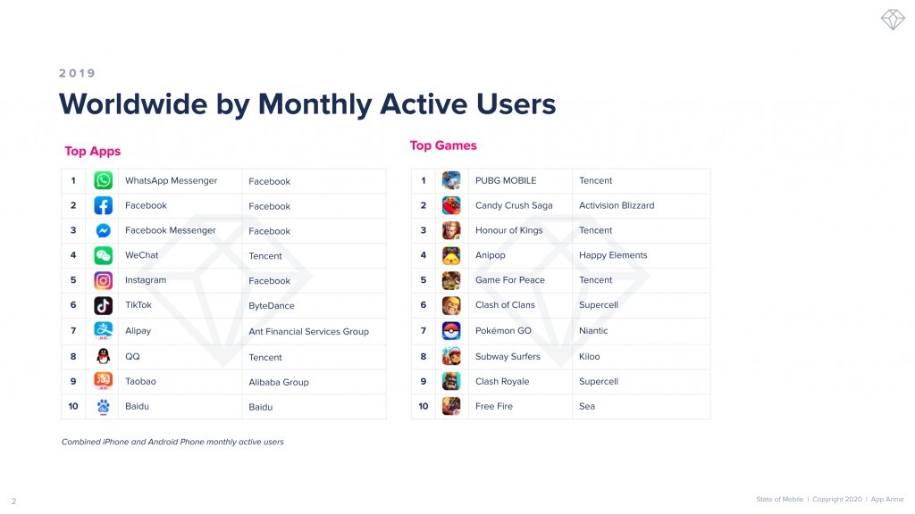Edhe pse TikTok ishte në krye të top listave të fundvitit, Facebook vazhdoi ta mposhtte atë për sa i përket MAU. Aplikacionet në pronësi të Facebook kontrolluan listat kryesore nga MAU, me Facebook në Nr. 1 të ndjekur nga WhatsApp, Messenger dhe Instagram.