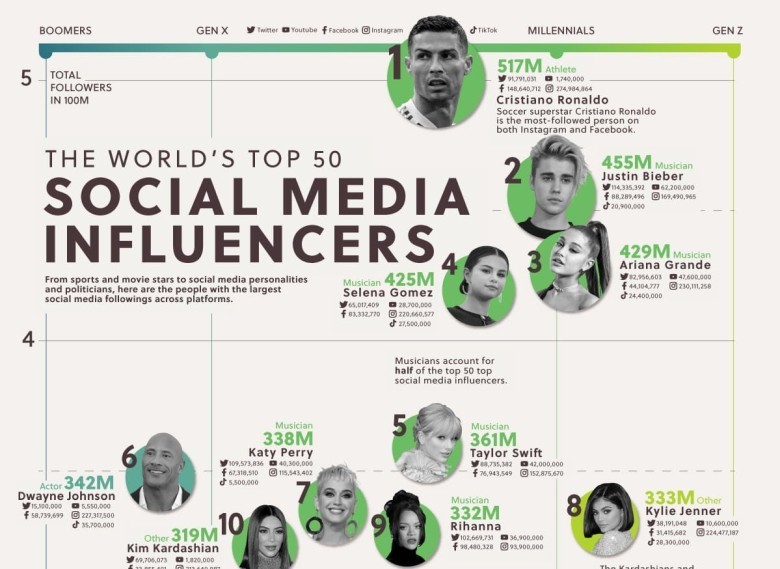 Dominues në renditjen e Top 50, ku përfshihen atletë, muzikantë, politikanë dhe personalitete të tjera, është superylli i futbollit Cristiano Ronaldo, më i ndjekuri në rrjetet sociale me mbi 517 milionë ndjekës në total, si në Instagram ashtu edhe në Facebook.