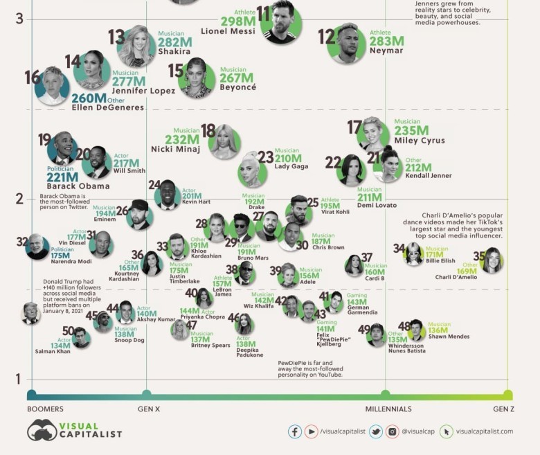 Cilët janë 50 influencuesit më të mirë në botë? Për të përcaktuar sasinë e aftësisë për të frymëzuar dhe drejtuar kontekstet ekonomike dhe të mendimit, ndërhyn Indeksi i Energjisë Gjeneruese (GPI) 2021, raporti i përgatitur nga Visual Capitalist, me një analizë tërthore për breza dhe grupmosha të ndryshme.
