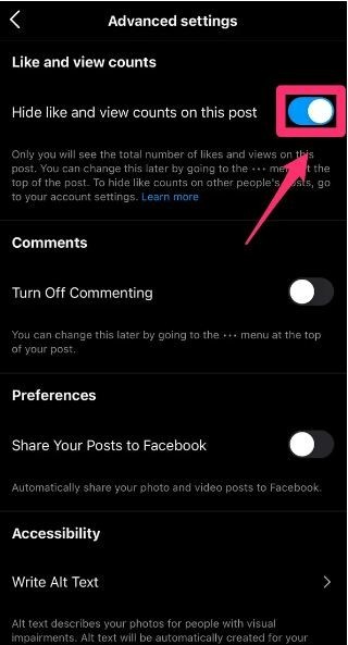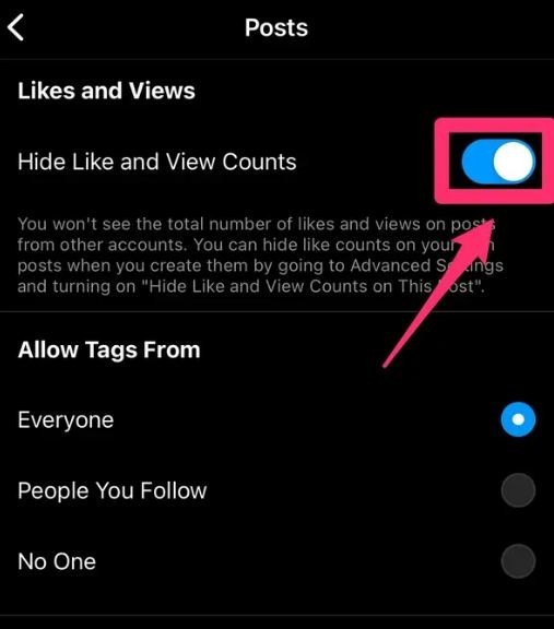 Hide like” dhe “View counts”. Kur aktivizohet kjo veçori bëhet ngjyrë blu.