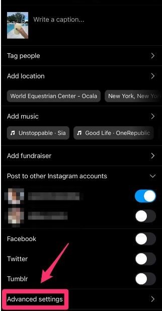 2. Në faqen e postimit të ri, faqja përfundimtare me butonin “Share” lart djathtas, klikoni “Advancet Settings”.