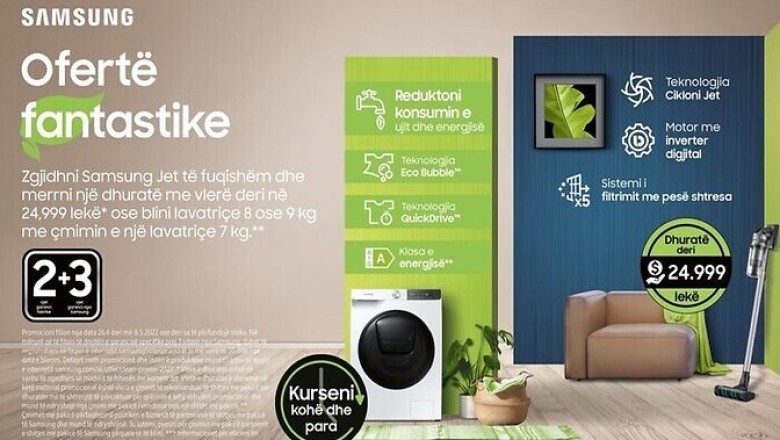 Me pajisjet elektroshtëpiake Samsung shtëpia juaj do të shkëlqejë në pranverë dhe tani mund të përfitoni një dhuratë me vlerë 24,999 lekë me blerjen e Samsung Jet ose mund të blini lavatriçe 8 ose 9kg me çmimin e një lavatriçeje 7kg. Promocioni zgjat nga data 26 prill deri më 8 Maj 2022 dhe për më shumë informacion vizitoni: https://samsung.com/al/offer/clean-promo-2022/.
