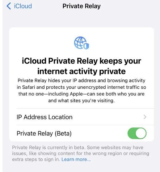 Shërbim privat iCloud/ Private Relay është një veçori e re që është e disponueshme për abonentët iCloud Plus. Ashtu si një VPN tradicionale, është krijuar për t'i mbajtur aktivitetet tuaja të shfletimit të internetit private duke “maskuar” vendndodhjen tuaj. Ai zëvendëson adresën tuaj IP me një anonime nga rajoni juaj i përgjithshëm gjeografik dhe nuk ndikon në performancën e shfletuesit tuaj. Sidoqoftë, funksionon vetëm me Safari, kështu që nuk mund të përdorni shfletues të palëve të treta me Stafetën Private dhe kërkon iOS 15.